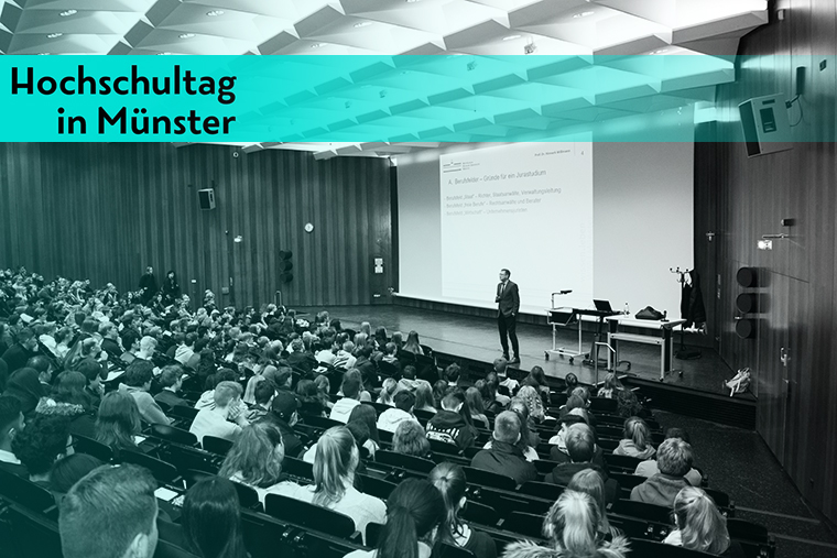 Zum Hochschultag der Westfälischen Wilhelms-Universität Münster (WWU) hat auch die Rechtswissenschaftliche Fakultät Schülerinnen und Schülern Einblicke in das Jurastudium gewährt. In sechs speziellen Veranstaltungen haben Hochschullehrer, MitarbeiterInnen und Studierende der Fakultät die (vielleicht) zukünftigen Studierenden über den Aufbau, die Struktur und Inhalte des Studiums informiert.