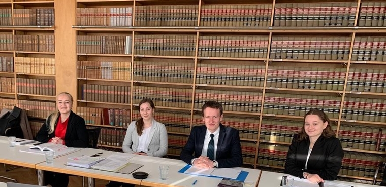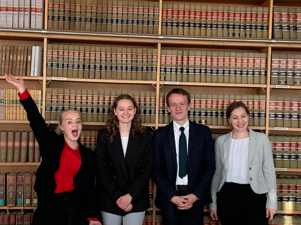 Mitte September letzten Jahres wurde der Sachverhalt veröffentlicht. In einem kleinen Büro hoch oben in der AUB durften sich die Vier ausbreiten und konnten so trotz Corona ein wenig echte Teamarbeit erleben. Einer Tradition der KollegInnen vom Jessup Moot Court folgend, verbrachte das Team außerdem ein Teambuilding-Wochenende in Selm. Das Team hat fantastische Unterstützung von seinem Coach David Nückel erhalten, der bereits 2015 am Moot Court teilgenommen und auch das Team im letzten Jahr begleitet hat. Zusätzlich haben sich zahlreiche Moot Court-Alumni gefunden, die dem Team in der Schriftsatzphase und in Vorbereitung auf die mündlichen Verhandlungen mit Rat und Tat zur Seite standen. Die Kanzlei Hogan Lovells hat das Münsteraner Team ebenfalls bei einem Probepleading unterstützt.