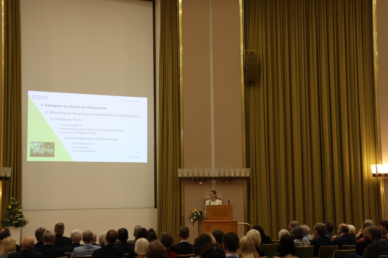 In ihrer dann folgenden Vorlesung zeigte Frau Prof. Dr. Wietfeld auf, dass der zur Eindämmung des Klimawandels erforderliche Klimaschutz auch Auswirkungen auf das Arbeitsrecht hat. Zunehmende Pflichten für Arbeitgeberinnen und Arbeitgeber, Klimaschutzvorgaben einzuhalten, sowie unternehmerische Entscheidungen, die Unternehmenspolitik nachhaltig auszurichten, können den Kanon der Pflichten im Arbeitsverhältnis verändern. Wenn der Gesetzgeber Private einsetzt, um Klimaschutzziele zu erreichen, kann sich diese Entscheidung im Verhältnis zu Arbeitsvertragspartnern dieser Privaten auswirken. Das arbeitsvertragliche Pflichtengefüge wandelt sich durch die Veränderungen, die politische und gesellschaftliche Reaktionen auf den Klimawandel hervorrufen. Können Arbeitgeberinnen und Arbeitgeber Klimaschutzziele nicht ohne Mitwirkung ihrer Arbeitnehmerinnen und Arbeitnehmer erreichen, trifft diese eine Pflicht, die Klimaschutzmaßnahmen durch ihre Mitwirkung zu unterstützen. Die Forschungsergebnisse, die Frau Prof. Wietfeld in ihrer Vorlesung präsentiert hat, werden im Jahr 2026 veröffentlicht.