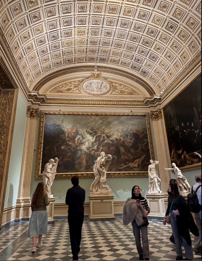 Am Dienstag, unserem letzten Tag, besuchten wir die Galleria dell’Accademia. Nach einem einführenden Vortrag erkundeten wir die Sammlung – ein Spaziergang durch die Kunstgeschichte von der Gotik über die Renaissance bis zum Barock. Höhepunkt war Michelangelos berühmte Skulptur des David. Im Anschluss ging es ins Kloster San Marco, wo wir nicht nur die eindrucksvollen Fresken Fra Angelicos betrachteten, sondern auch über die kontroverse Figur Savonarola sprachen. Ein kurzer Abstecher zur Basilika Santa Croce rundete den Nachmittag ab. Zum Abschluss der Reise führte uns ein Spaziergang zum Piazzale Michelangelo. Der Blick über das abendliche Florenz bot den perfekten Rahmen für den letzten Vortrag der Exkursion. Mit einem letzten gemeinsamen Abendessen endete eine rundum gelungene Reise.