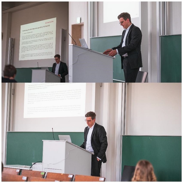 Dr. Dumke nahm für seinen Einblick Bezug auf das zuvor in der Vorlesung von Prof. Dr. Friederike Malorny behandelte Anhörungserfordernis des § 102 BetrVG. Anhand einer beispielhaften Betriebsratsanhörung zeigte er den Studierenden Fallstricke der Praxis auf und wie man mit diesen umgeht. Hierbei wies er insbesondere noch einmal auf die hohe Bedeutung der Anhörung hin, die in der Praxis ohne fachkundige Beratung häufig fehlerhaft ist.