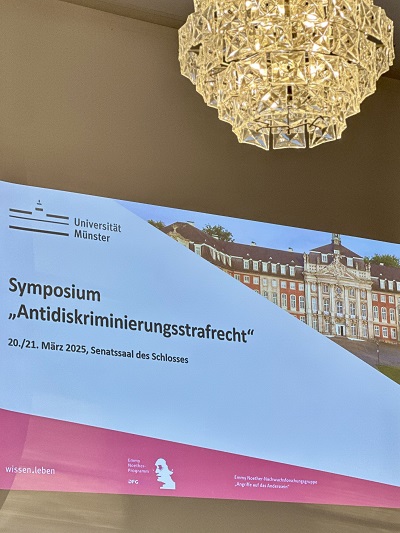 Am 20. März 2025 fand an der Universität Münster das Emmy Noether-Symposium zum Thema „Antidiskriminierungsstrafrecht“ statt, das von Prof. Dr. Leonie Steinl organisiert wurde. Ziel des Symposiums war es, der Frage nachzugehen, welche Rolle dem Strafrecht im Bereich des Diskriminierungsschutzes zukommt. Die Beziehung von Antidiskriminierungsrecht und Strafrecht sollte ihrer Natur als Querschnittsthema entsprechend von Rechtswissenschaftler:innen unterschiedlicher Fachsäulen ausgelotet werden, um im intradisziplinären Austausch die gegenseitige Anschlussfähigkeit zu prüfen.
